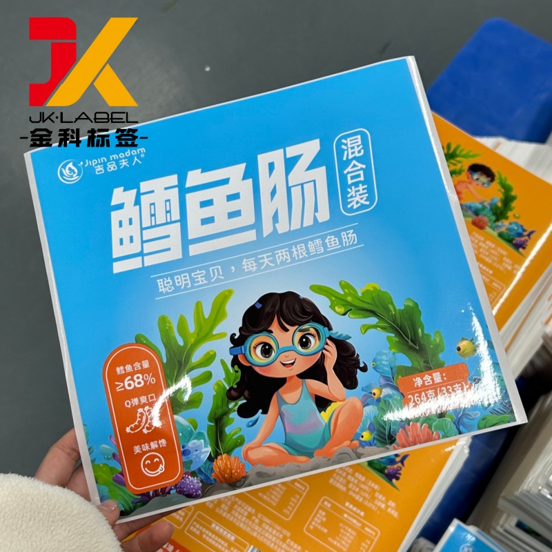 Sheet-Fed Snack Food Labels are widely used for frozen snacks, ready-to-eat foods, and retail food products that require clear presentation, stable adhesion, and high-quality printing. Based on the label shown, this product is designed for flat packaging such as frozen fish snacks, seafood-based products, and children-oriented food packaging. Our sheet snack labels are printed on carefully selected materials that provide good stiffness, smooth surfaces, and reliable ink adhesion. They are suitable for colorful designs, cartoon illustrations, nutritional information panels, and bilingual or multilingual text, which are commonly required in Southeast Asian food markets. These labels are supplied in sheet form, making them convenient for manual or semi-automatic labeling processes. With consistent cutting accuracy and clean edges, they help improve packaging efficiency while maintaining a neat appearance on finished products.